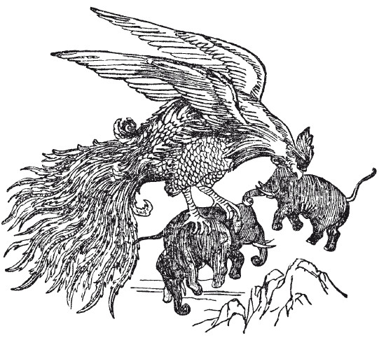 Рассказывают, что есть там птица гриф, появляется в известное время года, и во всем гриф не таков, как у нас думают и как его изображают; у нас рассказывают, что гриф наполовину птица, а наполовину лев; и это неправда. Те, кто его видел, рассказывают, что он совсем как орел, но только, говорят, чрезвычайно большой. Кто его видел, описывают его, как я слышал, так: рассказывают, что гриф очень силен и очень велик; схватит слона и высоко-высоко унесет его вверх, на воздух, а потом бросит его на землю, и слон разобьется; гриф тут клюет его, жрет и упитывается им. Кто видел грифа, рассказывают еще, что если он расправит крылья, так в них тридцать шагов, а перья в крыльях двенадцати шагов; по длине и толщина их.