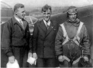 После удачного испытательного полета новой машины. Слева направо — В. Коккинаки, А. Яковлев, Ю. Пионтковский.