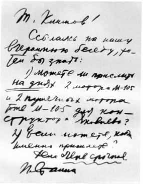 Фотокопия записки И. В. Сталина конструктору В. Я. Климову, написанной на одном из совещаний по вопросам авиации в Кремле летом 1939 года.