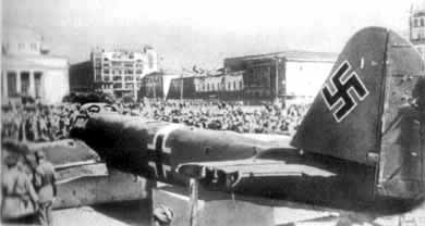 Один из первых сбитых под Москвой фашистских бомбардировщиков выставлен для осмотра на площади Свердлова.