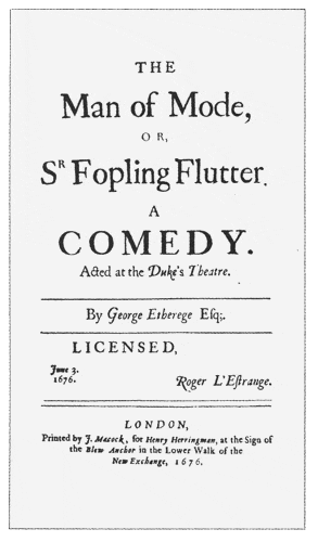 Прекрасно помню, что на первом представлении публика узнала и горячо приняла выведенных в пьесе персонажей — дам и господ, людей света и простых горожан; особенный же восторг вызвал Доримант. Зрители пришли к единодушному мнению о том, что этому образу придан целый ряд черт Уилмота, графа Рочестера, — острый ум, живость поведения, любовный темперамент и приемы, которыми он очаровывает прекрасный пол; далее, его завиральность, его непостоянство и совершенно особая манера распекать собственных слуг, на которую еще при жизни самого Рочестера обратил внимание покойный епископ Солсбери; наконец, его привычка то и дело цитировать стихи Уоллера, которого этот аристократ чтил исключительно высоко.