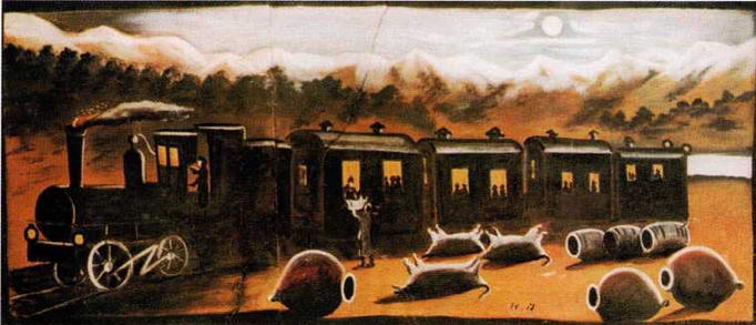 Этих кондукторов можно разглядеть на картине, написанной по воспоминаниям, - Батуми. Поезд здесь как раз выкатился из тоннеля и идет вдоль моря. На море множество разных судов, по склону горы разместились рядами городские домики. Поездки по железной дороге должны были немало обогатить зрительный опыт Пиросманашвили. Возможно, что он глазел по сторонам гораздо больше, чем требовалось.