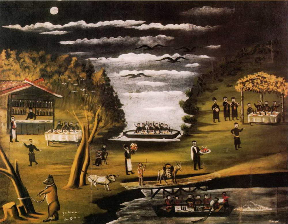 После этого случая Нико взял к себе жить брат Элисабед - Калантар. Спустя какое-то время Нико познакомился с молодым художником Гиго Зазиашвили, и ко второй половине 1880-х годов относится следующий жизненный шаг этого безумца. Вместе с Зазиашвили они открывают мастерскую по изготовлению живописных вывесок. Первую вывеску - для торговца рыбой - изготовили бесплатно. О других заказах ничего неизвестно. Вспомним, сколько в Тифлисе было маляров и художников, а Пиросмани, начав с нуля, решил сразу конкурировать с ними.