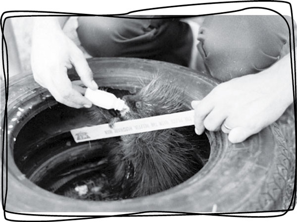 Кстати сказать, я не смогла найти фотографию Стенли, изувеченной белки (наверное, потому что идея сфотографировать беличий труп приходит всем слишком поздно), однако у меня есть фотография, на которой мой папа кормит из бутылочки детеныша дикобраза, лежащего в запасной шине, и мне кажется, что она будет к месту и даже немного оправдает моего отца. Правда, я только что заметила, что отец держит дикобраза ручкой от малярного валика, и по всей шине следы от краски. Так что вполне вероятно, что он кормит дикобраза малярной краской. Это маловероятно, но, впрочем, в нашем доме происходили и куда более странные вещи.