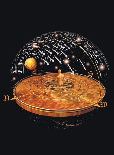 Вселенная по Птолемею. Птолемей, один из самых авторитетных гре-ческих астрономов того времени, предложил геоцентрическую теорию, сохранявшую главенствующее положение в течение 1400 лет. Представления Птолемея о Солнце, планетах и звездах давно признаны ошибочными, однако наше мировосприятие остается птолемеевским. Мы говорим, что Солнце восходит на востоке (хотя по отношению к Земле Солнце неподвижно), по-прежнему наблюдаем вращение небес над головой и ориентируемся на север, юг, запад и восток, словно забывая, что Земля круглая.