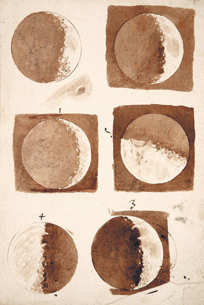 Акварельная зарисовка Галилея, изображающая фазы Луны.