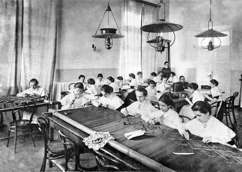 В начале декабря меня назначили к m-me Лалаевой в рукодельную, где нас в числе восьми девочек засадили вышивать оборочки по белому батисту, а потом туфли по бархату, что сначала мы делали плохо и неумело; потом многие стали выполнять изящные работы, подносимые разным высоким посетителям и посетительницам. Там мы пробыли дня три, приходя в класс только в часы Закона Божия. В верхней мастерской, где учили шить белье и вышивать по канве, я только два раза и была из старшего класса и всегда жалела бедную учительницу, которая, как говорили, была из прислуги графа Шереметева; над ней сильно смеялись и постоянно дразнили институтки.