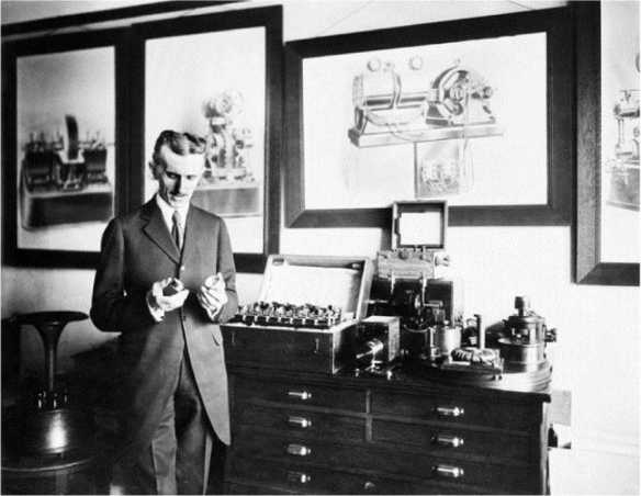 Тесла в лаборатории Радио-Сити с различными моделями своих катушек индуктивности.