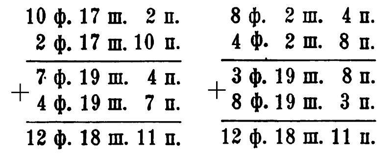 Когда Кларк показывал мне свою библиотеку и образцовую коллекцию всевозможных географических карт, то между прочим он спросил меня, знаю ли я, сколько нужно различных красок, чтобы раскрасить большую карту в разные цвета по губерниям — и так, чтобы повторяющиеся краски нигде не соприкасались на границах двух смежных губерний. Оказывается, что совершенно достаточно четырех различных красок, и доказательство этого положения представляет трудную задачу неопределенного анализа. В заключение моего беглого перечисления всего виденного в Редхиле у почтенного старца, приведу еще интересную задачу на английские деньги. Известно, что английский фунт делится на 20 шиллингов, а шиллинг на 12 пенсов. Напишите какую-нибудь денежную сумму, меньшую 12-ти фунтов и такую, чтобы число фунтов не равнялось числу пенсов; переставьте числа в обратном порядке, т. е. напишите вместо фунтов пенсы и наоборот, и вычтите одно число из другого; затем вновь переверните числа и сложите. Полученная сумма всегда равна 12 ф. 18 ш. 11 п. Вот два примера, подтверждающие это заключение, но его легко доказать и аналитически:
