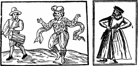 Слева: Уильям Кемп, комик, ушел из труппы Шекспира обиженным и, чтобы взять реванш, танцевал от Лондона до Нориджа. Его заменил более тонкий комик, Роберт Армии (справа)