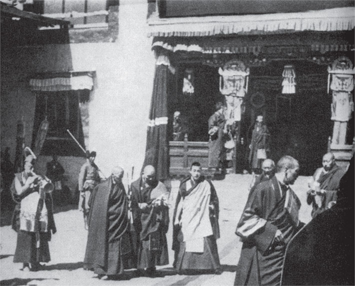 В один прекрасный, по-настоящему теплый весенний день начались приготовления к процессии. Уже с самого утра все были на ногах. Одни, как это обычно делалось, поливали водой из глиняных кувшинов всю пыльную дорогу до Норбу Линка. Другие выкладывали камни по линии, прочерченной известкой с обеих сторон дороги, чтобы не подпустить к правителю злых духов (по местному поверью, такие препятствия не дают им пересечь дорогу). Потом из города двинулись огромные толпы, так что мне было очень непросто найти среди этой толкотни безопасное место, куда можно было бы встать с камерой. В этом, как и в других подобных случаях, мне очень помог мой слуга. Это был здоровенный детина с рябым от оспин лицом, один вид которого нагонял страх. Этот преданный слуга все время носил мою камеру и обеспечивал мне проход через толпу. Он не только внушительно выглядел, но и имел случай продемонстрировать свою храбрость в одной действительно опасной ситуации.