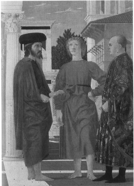 Аллегорическое изображение Фомы Палеолога (в центре), кардинала Виссариона (слева) и герцога Феррары Никколо III д’Эсте (справа). Пьеро делла Франческа. Бичевание Христа. Вторая половина 1450-х гг. Фрагмент