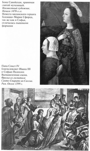 Можно думать, что на церемонии заочного обручения Софьи присутствовали и миланские послы при папском дворе — епископ Новары и впоследствии кардинал Джованни Арчимбольди, а также Никодим Транкедини де Понтремоли.{283} В мае — июне 1472 года они находились в Риме. Есть достоверные известия о том, что они присутствовали на аудиенции, которую русские послы получили у папы: миланские представители отправили герцогу депешу с известием об этой аудиенции. Не очень близкая, но давняя связь младшей ветви династии Палеологов с двором герцогов Сфорца[3] позволяет предположить, что герцогу было любопытно, как проходило столь важное мероприятие.