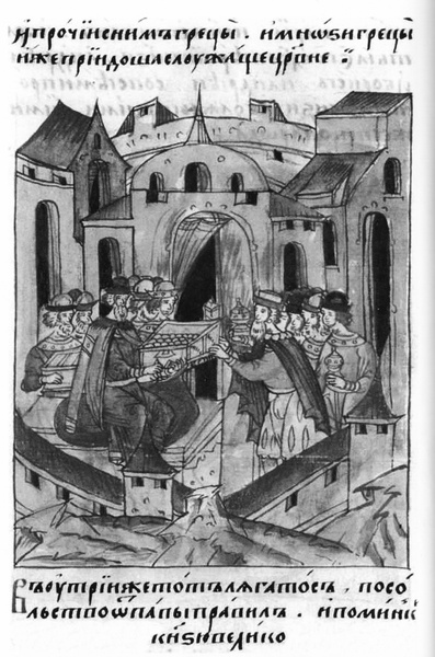 Папский легат Антонио Бонумбре преподносит Ивану III дары от папы римского. Возможно, на миниатюре изображены шесть тысяч золотых дукатов, которые папа выдал Софье перед отъездом на Русь. Миниатюра Лицевого летописного свода