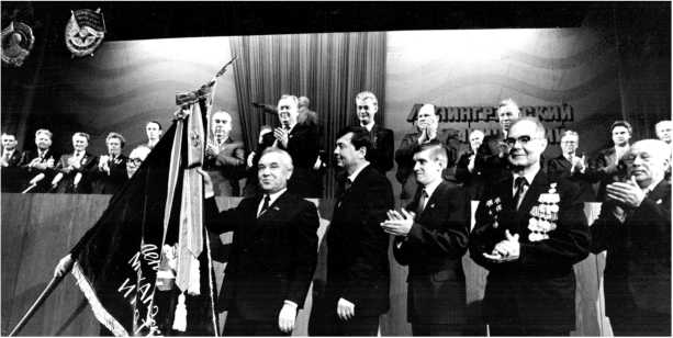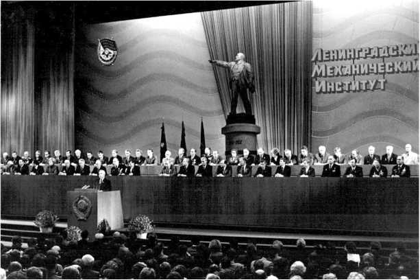 По сложившейся традиции был избран почетный президиум во главе с Л.И. Брежневым, поздравление от которого зачитал первый секретарь Ленинградского обкома КПСС Г.В. Романов. Затем на авансцену в сопровождении Е.В. Кулькова, А.В. Лясникова, В.К. Ерофеева, Г.Г. Шелухина было вынесено знамя Ленинградского механического института, и к его орденской ленте Г.В. Романов прикрепил орден Ленина. Зал стоя приветствовал это событие долгими аплодисментами.