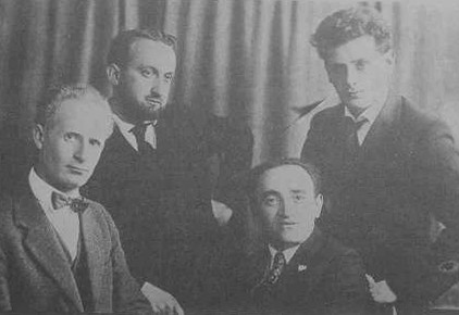 Перец Маркиш с еврейскими писателями. Сидят слева направо — Лейвик, Иосиф Опатошу. Стоят: слева направо — Мейлах Равич, Перец Маркиш. Варшава, 1925 г.