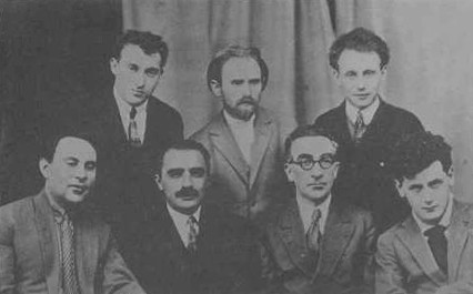 Перец Маркиш с группой еврейских писателей. Сидят: слева направо — Лейб Квитко, Дер Нистер, Шахно Эпштейн, Перец Маркиш. Стоят слева направо — Абрам Каган, Фельдман, Меир Даниэль. Киев. 1927 г.