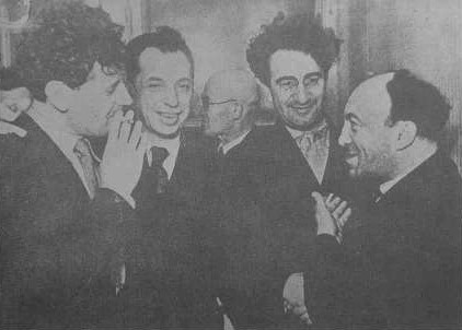Перец Маркиш (первый слева), Давид Бергельсон, Изи Харик, Соломон Михоэлс. На заднем плане — редактор еврейской еженедельной газеты «Дер Эмес» Моисей Литваков. Москва. 1935 г.