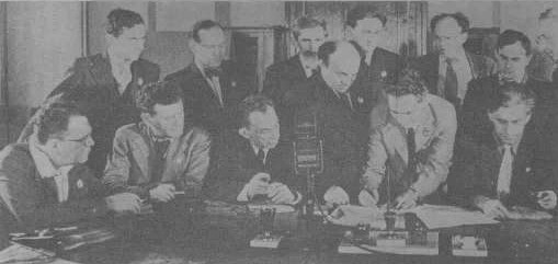 Перец Маркиш на 1-ом совещании еврейских писателей. Сидят: слева направо — Ицик Фефер, Изи Хари, Александр Фадеев, Перец Маркиш, Яков Бронштейн. Стоят: слева направо — Годинер, Нотэ Лурье, Моисей Литваков, Меир Даниэль, Арон Кушниров, Мойше Кульбак. Москва. 1929 г.