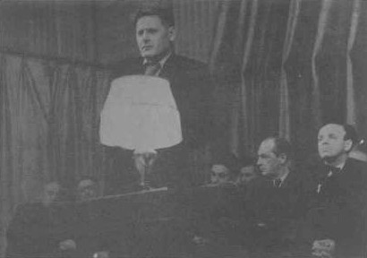 Перец Маркиш читает свое стихотворение «Михоэлсу — неугасимый светильник» на вечере памяти Соломона Михоэлса. Крайний справа — Вениамин Зускин. Москва, февраль. 1948 г.