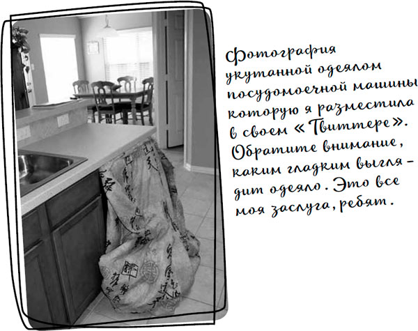 Зайдя в «Твиттер», я написала: «Чисто гипотетически, если я случайно положу стиральный порошок в посудомоечную машину, она от этого не взорвется? Ответ нужен как можно скорее». Половина из ответивших были такие все: «Ой, да все будет нормально, дубина», а вторая половина были такие типа: «СКОРЕЕ УБЕГАЙ ИЗ ДОМА». Один парень написал: «На самом деле порошок помогает смыть пятна от крови», и мне оставалось только гадать, для чего он использует свою посудомоечную машину. Как бы то ни было, я все еще нервничала и обернула вокруг посудомоечной машины одеяло на случай, если из нее польется, потому что одеяла – они как огромные прокладки. Я гордилась своей изобретательностью, но радовалась я недолго – десять минут спустя пришел Виктор и сказал: