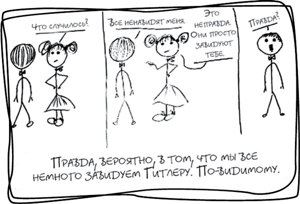 Я: Чувак, это еще как смешно. Ну ты понял? Потому что люди все время говорят: «Они ненавидят меня, потому что завидуют». Но это ведь Гитлер, и все правда его ненавидят, но совсем ему не завидуют.