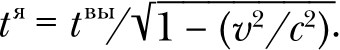 Стоит взглянуть на сокращенную версию преобразований Лоренца для времени195, поскольку это одно из важнейших уравнений в истории изучения времени. Это всего-навсего алгебраическое уравнение, которое связывает время на ваших часах, когда вы перемещаетесь в поезде (tвы), со временем на моих часах, когда я стою на платформе (tя), при условии, что мы оба запустили часы ровно в тот момент, когда вы проносились мимо меня. В этом уравнении v — скорость нашего движения относительно друг друга, а c — скорость света: