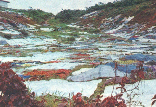 Миновав несколько похожих друг на друга пыльных поселков, мы решили, что находимся в загородной зоне. Листва обступивших дорогу деревьев и кустарников становилась все свежее и зеленее. Мы уже подумывали об остановке, как вдруг за поворотом деревья расступились, и нам открылось удивительное зрелище. Весь склон обширного холма полыхал пестрыми, яркими красками. Всюду на траве и кустах были расстелены и развешаны куски ткани самой невероятной и разнообразной расцветки. Казалось, все женщины Абиджана устроили на этом холме выставку своих туалетов. Мы не сразу поняли, что все это означает, но оперативный Збышек уже дал знак шоферу остановиться.
