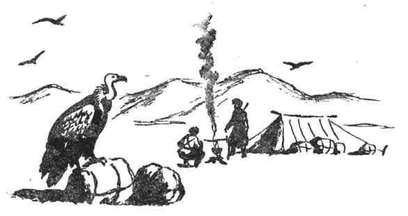 Путь вперед, к Лхасе, был заперт: в небольшом расстоянии от стоянки было собрано до тысячи тибетских солдат. Сношения с окрестными туземцами тоже были затруднительны, частью по незнанию языка, частью вследствие недоверчивости тибетцев, внушенной им властями. Единственным развлечением экспедиции была охота за орлами-ягнятниками и за снежными грифами. Птицы эти беспрестанно прилетали к стоянке в надежде поживиться куском бараньего мяса. Ягнятники садились иногда не далее двадцати шагов от занятых варкою пищи казаков. Грифы иногда собирались стаями штук в сорок.