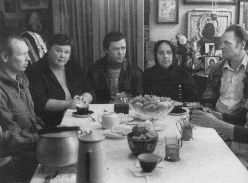 В гостях у священнослужителя отца Николая (Овчинникова). Слева направо: учёный-эколог Фотей Шипунов, кинорежиссёр Ренита Григорьева, Валентин Распутин, матушка Мария (Овчинникова), писатель Владимир Крупин. Елец. 1978 г.