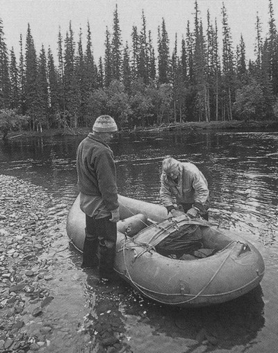 На надувной лодке от верховьев реки Лены до её обжитых берегов: Валентин Распутин и учёный-охотовед Семён Устинов (справа). Снимок сделан третьим участником экспедиции фотохудожником Борисом Дмитриевым