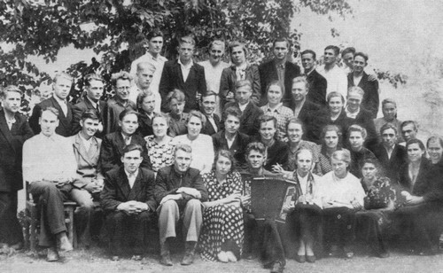 В. М. Шукшин (в верхнем ряду пятый справа) в период своего учительства в Сростках среди местной интеллигенции и активистов. «Одно время я был учителем сельской школы для взрослых. Учитель я был, честно говоря, неважнецкий»