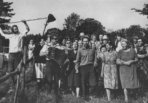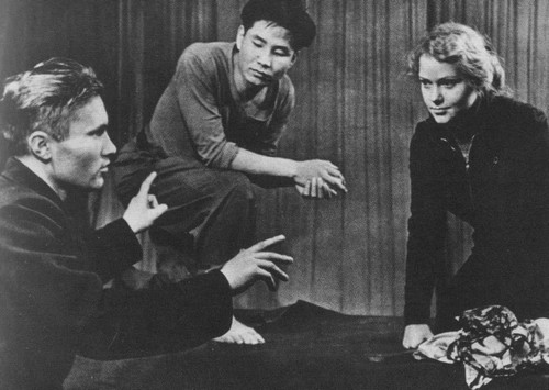 Режиссерская постановка В. М. Шукшина во ВГИКе. Справа — Ирма Рауш, первая жена А. Тарковского. «Вася Шукшин был яркой фигурой нашего курса, человеком, не похожим ни на кого из нас». Вторая половина 1950-х гг.