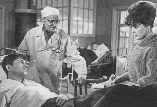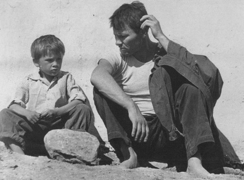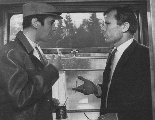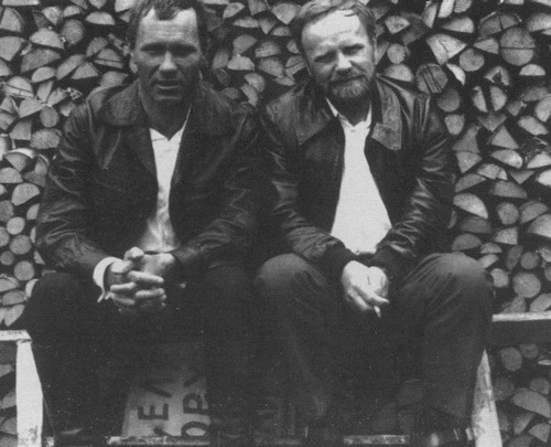 С Юрием Никулиным в картине «Когда деревья были большими»: «Держался Шукшин на съемках в стороне, на шутки не реагировал. Мне он показался человеком странным, нелюдимым и не очень интересным». 1961 г.