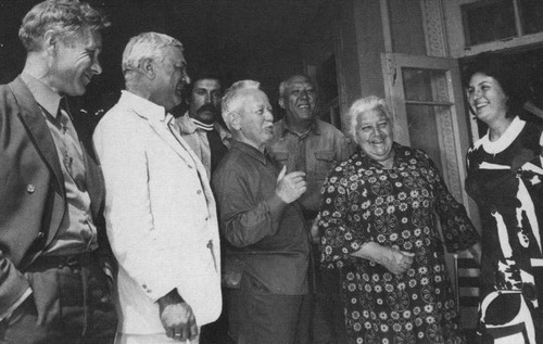 Съемочная группа картины «Они сражались за Родину» в гостях у Михаила Шолохова в Вешенской. «Шолохов перевернул меня. Он мне внушил не словами, а присутствием своим в Вешенской и в литературе, что нельзя торопиться, гоняться за рекордами в искусстве, что нужно искать тишину и спокойствие, где можно глубоко осмыслить судьбу народа…»