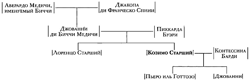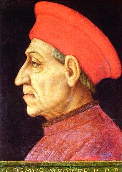 Козимо Старший — первый выдающийся представитель рода Медичи, банкир, но, кроме того, и политик, фактический правитель Флоренции и основатель величия Медичи, прозванный даже Отцом Отечества. Сын Джованни ди Биччи Медичи и его жены Пиккарды Буэри, рожденный во Флоренции в 1389 году в день святых Косьмы и Дамиана, свое имя получил в честь первого из них — покровителя врачей. Впрочем, того, что он станет врачом, не предполагалось — его ждало более прибыльное занятие, которому посвящал себя в то время его отец. Джованни ди Биччи Медичи был истинным творцом банка Медичи и семейного состояния. Он обладал также значительным политическим влиянием, но богатство и власть не сделали его заносчивым. Важно, что привитые отцовским воспитанием умеренность и скромность прочно закрепились в качестве черт характера Козимо. Семья, традиционно разделявшая устремления жителей Флоренции среднего достатка — так называемых popolo minuto, — имела многочисленных врагов среди городских патрициев. Молодой Козимо, получив хорошее образование, приобрел знания и любовь к античному наследию. Он владел многими современными языками, изучал латынь, греческий, еврейский. Всю свою жизнь он обнаруживал гуманитарные пристрастия и считался человеком «образованным значительно более того, как это пристало простому торговцу», как отметил папа Пий II. Практические знания, необходимые для проведения финансовых операций, он получал под присмотром отца, а позднее — работая в расположенных в разных городах филиалах семейного банка. В этой области он обнаруживал врожденный талант, теория же и практика банковского дела стали его истинной страстью — второй после гуманитарных и художественных интересов.