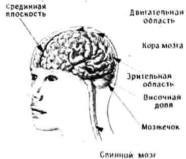 Рис. 5.1. Головной мозг человека. При взгляде, как сказать, извне видны два массивных симметричных полушария, поверхность которых представляет собой кору мозга с многочисленными извилинами, состоящую из плотно упакованных нейронов (серого вещества). Отдельные области коры ответственны за разные функции, от приема сенсорной информации (зрительной, обонятельной, тактильной) до посылки двигательных команд. Для нас наиболее важна область, называемая височной долей, так как она связана с различными аспектами памяти. Именно эта область подвергалась стимуляции в опытах Пенфилда. За полушариями мозга расположен мозжечок, функция которого, помимо прочего, состоит в тонкой координации движений. От головного мозга отходит спинной мозг, от которого нервные волокна направляются к периферическим участкам тела.
