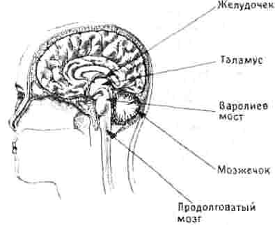 Рис. 5.2. Разрез мозга по срединной плоскости. Здесь видны некоторые внутренние структуры, лежащие ниже коры больших полушарий.
