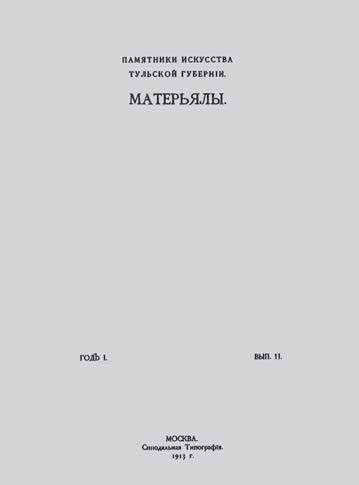 4 Памятники искусства Тульской губернии. Матерьялы. [Изд. Тульского отдела Общества защиты и сохранения в России памятников искусства и старины]. Год I, вып. I. М., 1912, 4 c., 17 табл.; год I, вып. II. М., 1913, 3 с., 48 табл.; год II, вып. I. М., 1913, 1 + 27 с., 27 табл.; год II, вып. II. М., 1913, 11 с., 57 табл.; год III, вып. I. М., 1914, 31 с., 59 табл.; год III, вып. II. М., 1914, 3 с., 21 табл.
