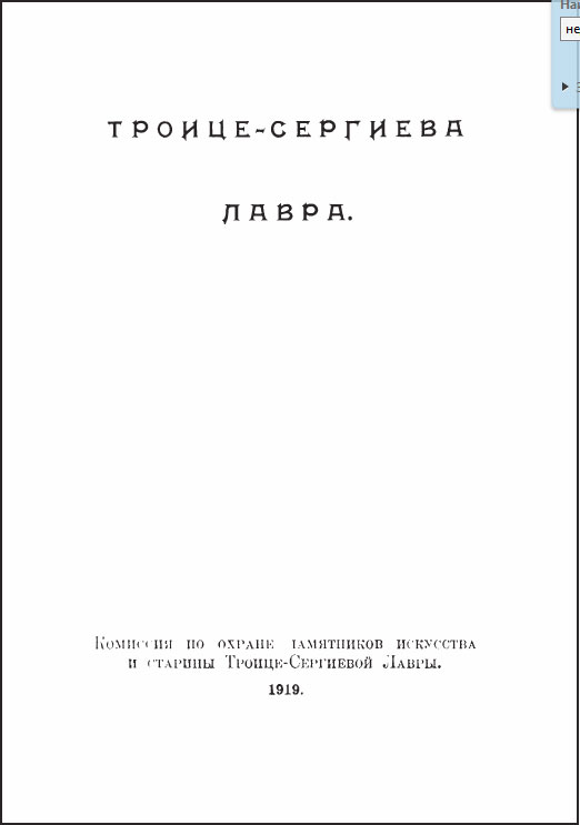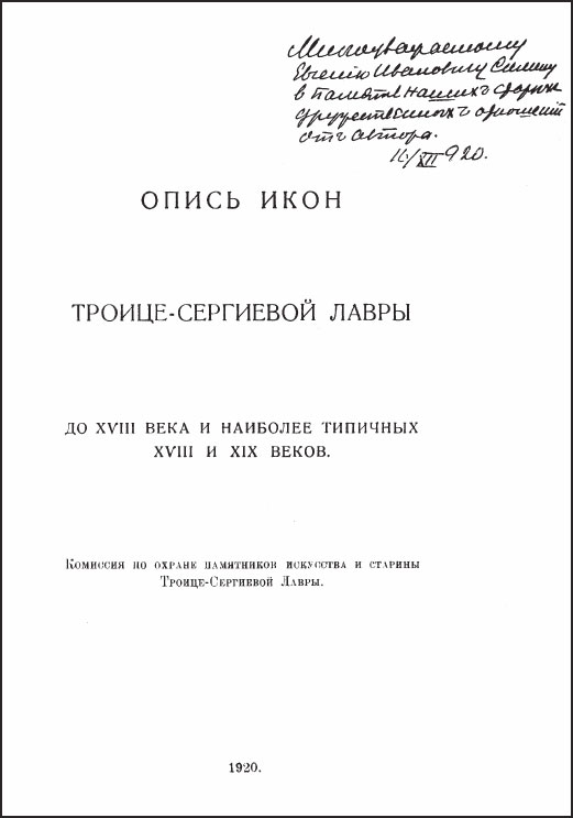 9 Опись икон Троице-Сергиевой лавры до XVIII века и наиболее типичных XVIII и XIX веков. Изд. Комиссии по охране памятников искусства и старины Троице-Сергиевой лавры. Сергиев, 1920, 4 + 268 с. [Тираж 1500 экз.]
