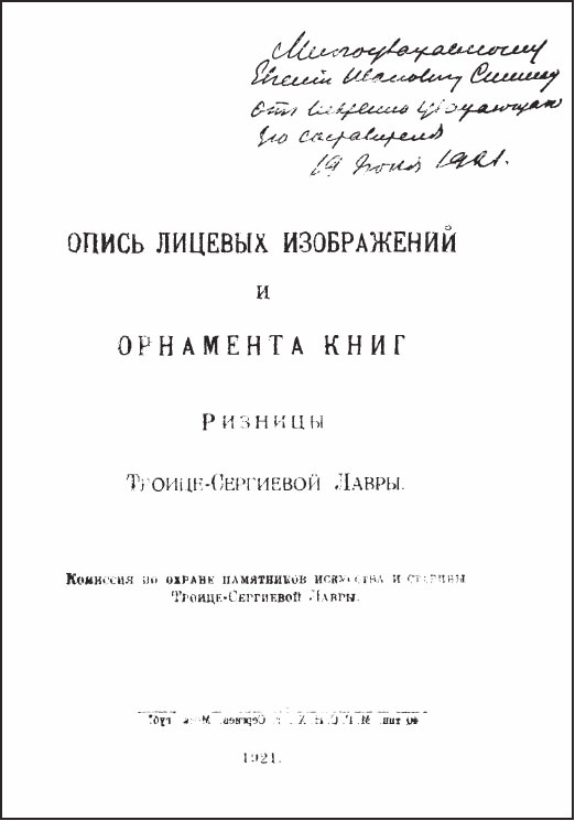 11 Опись лицевых изображений и орнамента книг ризницы Троице-Сергиевой лавры. Изд. Комиссии по охране памятников искусства и старины Троице-Сергиевой лавры. Сергиев, 1921, VIII + 96 с. [Тираж 600 экз.]