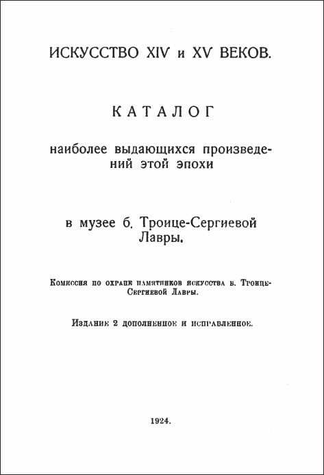 15 Искусство ХIV и ХV веков. Выставка при музее б. Троице-Сергиевой лавры. 1924 год. Изд. Комиссии по охране памятников искусства б. Троице-Сергиевой лавры. Сергиев, 1924, 16 с. Тираж 300 экз.