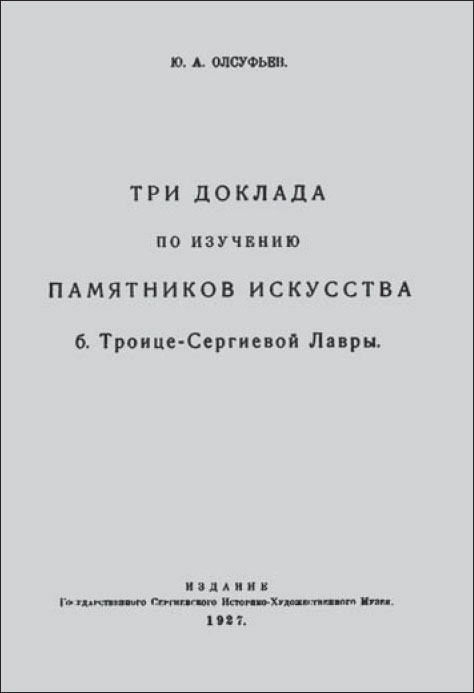 Поскольку в личном архиве Ю. A. Олсуфьева нет даже черновых списков собственных изданных работ, настоящий перечень составлялся с учетом изданий, имеющихся в Российской Государственной библиотеке, в научном архиве и библиотеке Сергиево-Посадского историко художественного музея-заповедника и в той части библиотеки Ю. А. Олсуфьева, которая хранилась в собрании Е. П. Васильчиковой (Москва). При некоторых изданиях, прежде всего при книжечках и статьях Ю. А. Олсуфьева, опубликованных с 1919 по 1928 год Комиссией по охране памятников искусства и старины Троице Сергиевой лавры и Сергиевским историко-художественным музеем, мы сочли необходимым дать пояснения о тиражах издании, поскольку последние являются ныне библиографической редкостью. Для ряда работ такие сведения, отсутствующие в выходных данных, извлечены из архива Сергиево-Посадского музея (оп. 1, № 71, л. 16). Они указаны в квадратных скобках.