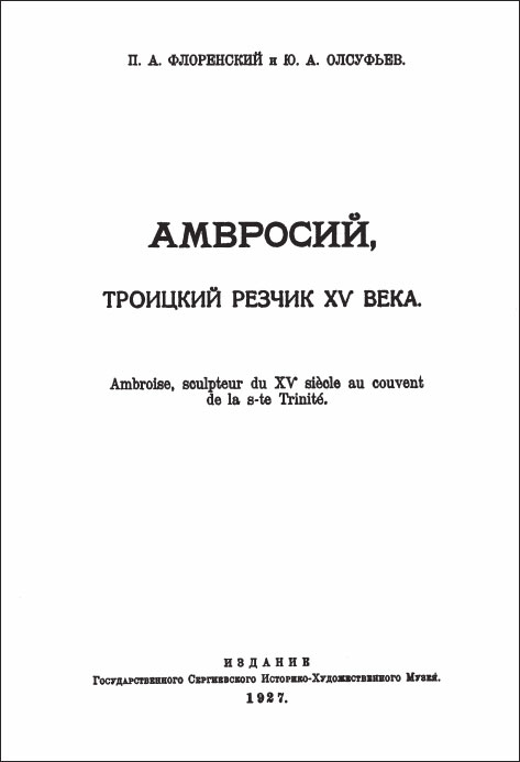 31 Амвросий, троицкий резчик ХV века. [Совместно с П. Л. Флоренским]. Изд. Гос. Сергиевского историко-художественного музея. Сергиев, 1927, 58 с., 1 + 49 ил. Тираж 300 экз.