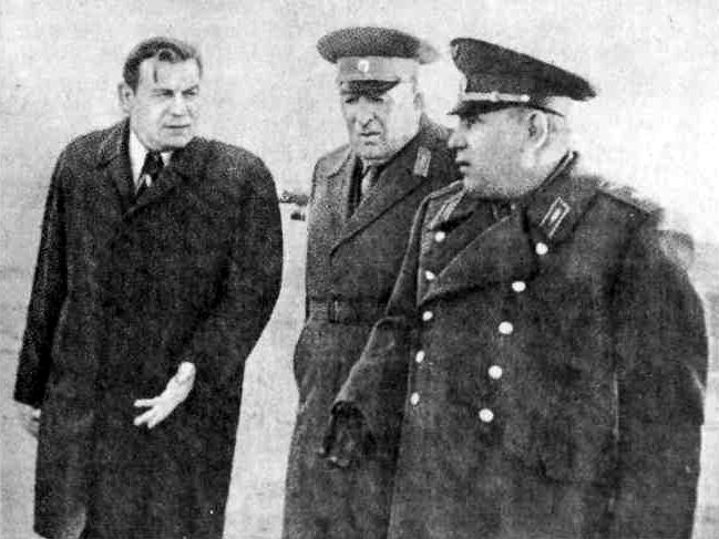 Послевоенная встреча (справа налево): Председатель ЦК ДОСААФ СССР трижды Герой Советского Союза маршал авиации А. И. Покрышкин, Председатель ЦК ДОСААФ Грузинской ССР Герой Советского Союза генерал-лейтенант в отставке В. Н. Джанджгава и второй секретарь ЦК КП Грузии Г. В. Колбин на Тбилисском аэродроме.