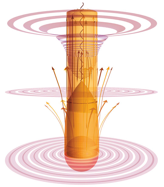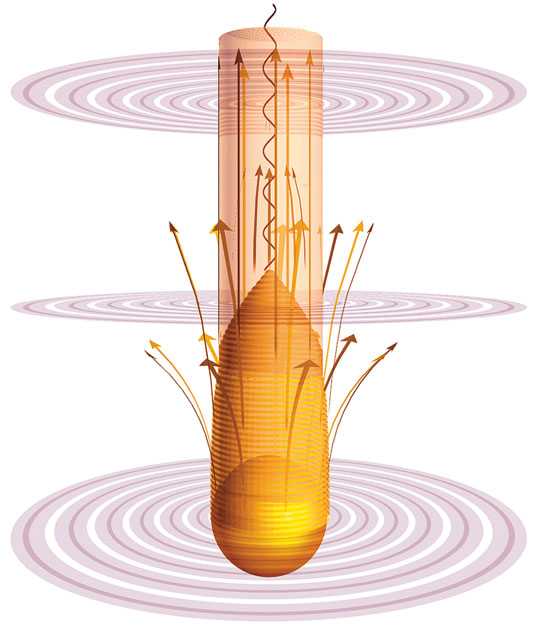 Звезда начинает схлопываться (средняя стадия), ее свет стягивается обратно к поверхности, пока не возникает граница (горизонт событий), за которую свет уже не может вырваться.