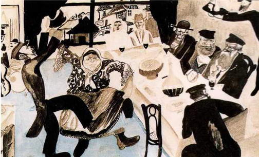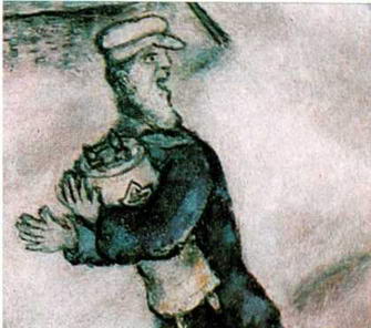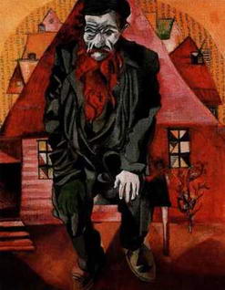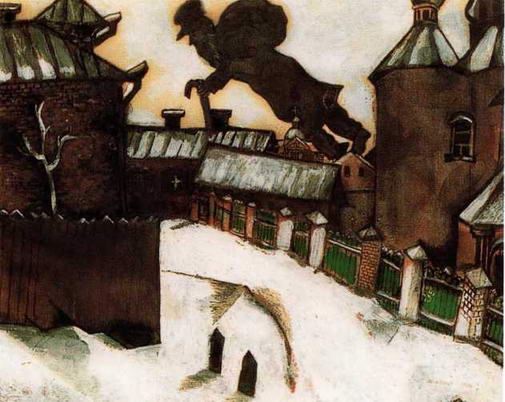 Однажды ранним утром, еще до зари, под нашими окнами раздались крики. При слабом свете фонаря я еле разглядел бегущую по пустым улицам женщину. Она размахивала руками, рыдала, заклинала, чтобы кто-нибудь - а все еще спали - спас ее мужа <."> и бежала дальше. <".> Каждый что-то говорил, советовал, кто- то растирал больному руки и натужно дышащую грудь. Камфарой, спиртом, уксусом. Поднялся стон и плач. Но самые умудренные, все повидавшие старики выводят женщин, не спеша зажигают свечи и в наступившей тишине принимаются громко читать молитвы у изголовья умирающего". Этот эпизод детства, рассказанный художником в автобиографии, в 1908 году превратился в сурово-романтическую картину. Шагал осуществил операцию по преображению действительности. Здесь едва ли не впервые появляется навязчивый образ шагаловских фантазий - скрипач, играющий на крыше.