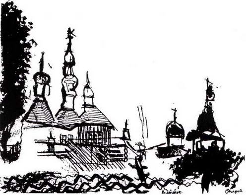 Внизу - "Витебск" (1908). Рисунок пером позволяет различить очертания крыши синагоги. Шагал всю жизнь будет воспринимать родину как приют души и самый непосредственный источник творческого вдохновения.