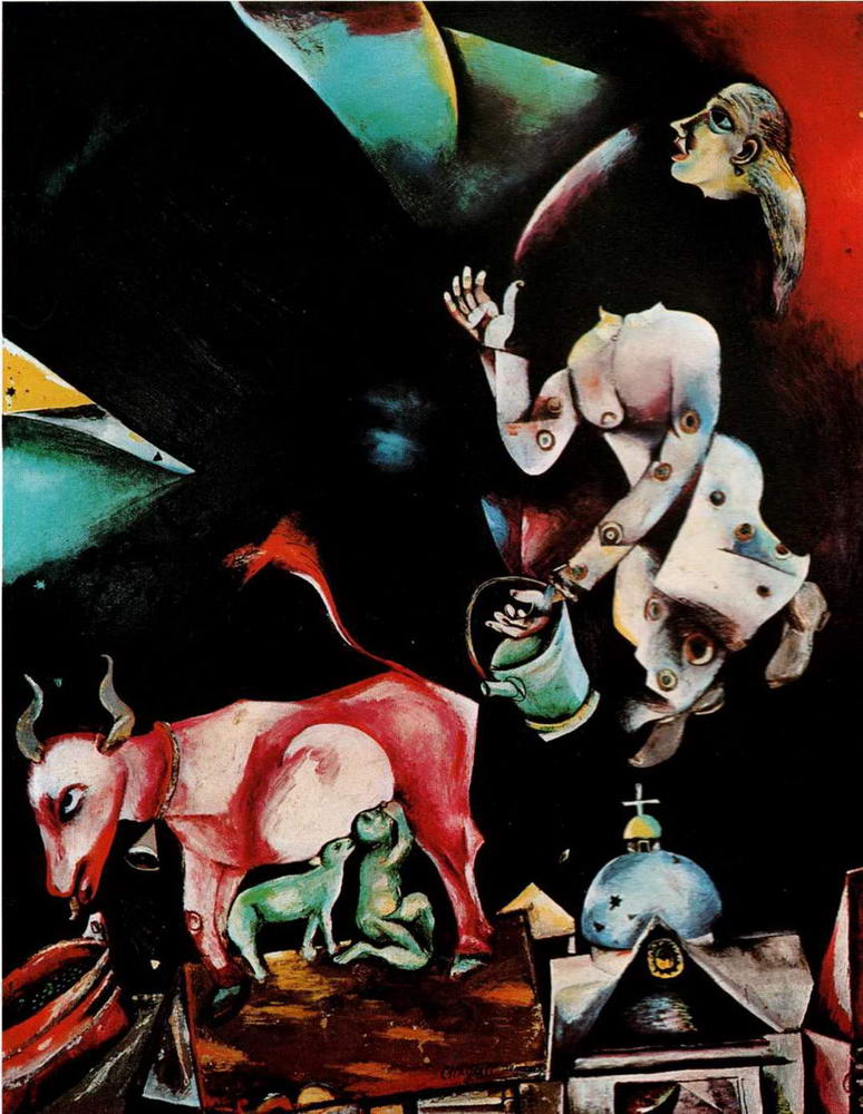 О браз Витебска проходит через все обширное творческое наследие Шагала. В Париже, куда он приезжает в 19Ю году, Шагал боится смешаться с тридцатью тысячами работающих в городе художников. И тогда его поддерживает воспоминание о родном Витебске. Перед тем как уехать из Витебска, художник молился и просил у Бога послать ему знамение: "В ответ город словно раскололся на части, лопнул, как скрипичная струна, и все жители стали ходить над землей, покинув свои привычные места. Старые знакомые расположились отдохнуть на крышах". Шагал со вниманием отнесся к новому художественному языку кубистов, но для него анализ объективной реальности и применение заимствованных из геометрии приемов для достижения выразительности имеют смысл только при условии, что главная роль в картине отведена свободному полету фантазии. Люди, очеловеченные животные и перевернутые фигуры создают тот театр, что берет свое начало в памяти, где сожаление соседствует с благодарностью.