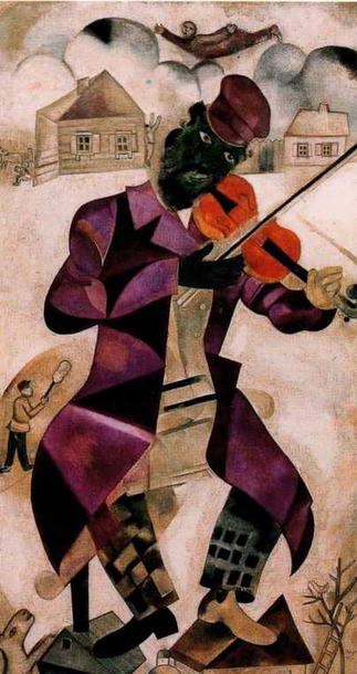 У Шагала категории пространственной протяженности и временной длительности теряют функцию определяющих координат человеческой жизни. Габариты зданий и фигур персонажей всегда произвольны. Точно так же прошлое, настоящее и будущее сливаются в едином, нерасчленимом потоке. Огромные фигуры исполнены символического смысла, примерами чего могут служить и амстердамский "Скрипач" и "Зеленый скрипач" 1923 -1924 годов, хранящийся в нью- йоркском Музее Гугенхейма.